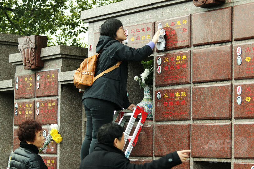 中国人は「厚葬(手厚く葬る)」「入土為安(埋葬されて安らぎを得る)」という伝統の死生観があるが、上海の墓地にも限りがあり、高齢化社会の影響もあり、花や樹木の下に遺骨を埋める樹木葬、マンション型の「壁葬」といった「節地・生態葬」が提唱されている。(c)CNS/JCM/AFPBB News