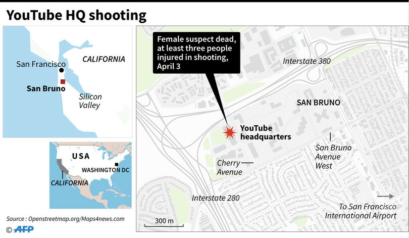 事件は3日、同州のハイテク産業集積地「シリコンバレー(Silicon Valley)」を構成するサンフランシスコ(San Francisco)近郊のサンブルーノ(San Bruno)で発生。容疑者は、同市にあるユーチューブ本社で9ミリ拳銃を発射して3人を負傷させた後、警察が同社の敷地を取り囲む中で自殺した。