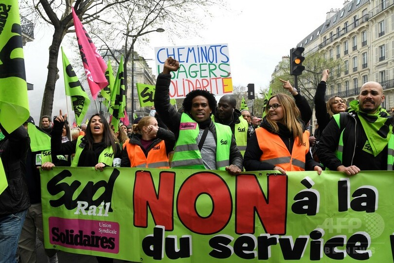 投資銀行出身のマクロン大統領は、経済成長と累積財政赤字の削減を目指した大改革によってフランスを再建すると約束している。昨年秋には労働法の改正を断行したが、国内ではデモが相次いでおり、今回の大規模ストはマクロン氏の決意を問う試金石とみられている。(c)AFP/ Katy Lee