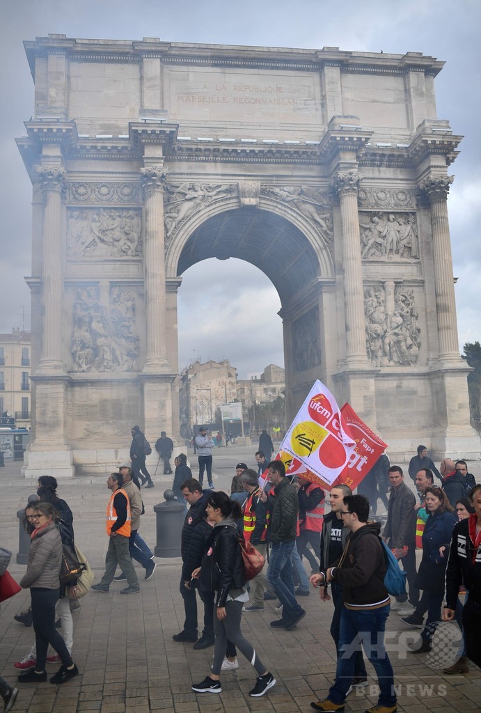 一方、南部マルセイユ(Marseille)では元港湾労働者や郵便配達人、学生などさまざまな立場の人々が集まり、マクロン大統領は公共サービスを廃止しようとしているとして抗議の声を上げた。