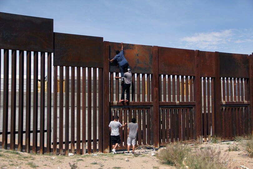 この若者の越境を手助けした男性は3人。2人は壁を登る若者を押し上げる役で、もう1人は見張り番だ。若者は友人の手を借りてさびついた金属製の壁をよじ登り、壁を越えてメキシコ側のシウダフアレス(Ciudad Juarez)から米国側のニューメキシコ州サンランドパーク(Sunland Park)に入った。わずか2分足らずの出来事だった。