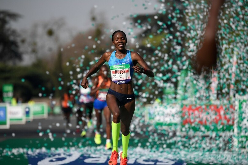 男子の部を制したロンヤンガタはこの日、16分26秒早くスタートした女子の部のレースで先頭を走っていたサイナを、残り数百メートルの時点で追い越し、最後はほぼ2人同時にフィニッシュした。(c)AFP