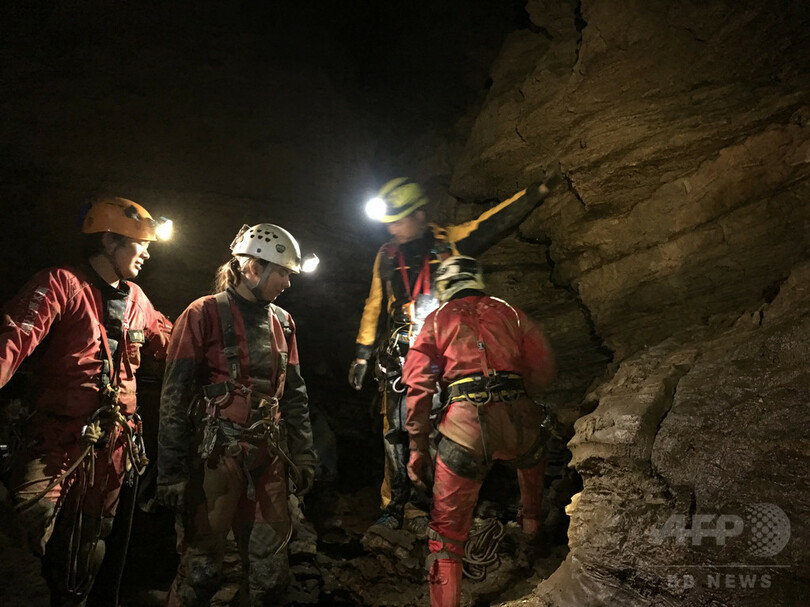 調査には中国とフランスのほか、カナダ、ポルトガルから30人以上の洞窟探検家が参加した。洞窟の「長さ」とは、洞窟の主洞、支洞、立て坑、地下河川の合計のこと。科学調査員が洞窟に入り、各地点の座標を記録し、洞窟地図を作成することで、洞窟の長さを確認できる。(c)CNS/JCM/AFPBB News