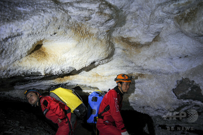 調査には中国とフランスのほか、カナダ、ポルトガルから30人以上の洞窟探検家が参加した。洞窟の「長さ」とは、洞窟の主洞、支洞、立て坑、地下河川の合計のこと。科学調査員が洞窟に入り、各地点の座標を記録し、洞窟地図を作成することで、洞窟の長さを確認できる。(c)CNS/JCM/AFPBB News