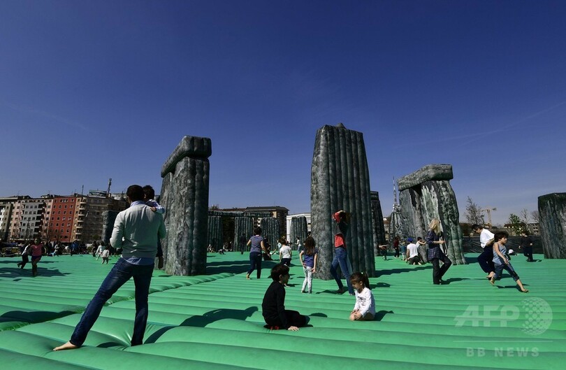 「サクリージ(Sacrilege、冒とく)」と題された、空気で膨らませるこのストーンヘンジは、英国人アーティストのジェレミー・デラー(Jeremy Deller)氏の作品で、ニコラ・トラサルディ財団(Foundation Nicola Trussardi)が、マッシミリアーノ・ジョルニ(Massimiliano Gioni)氏の企画で、今回で23回目となるこのイベントに展示した。(c)AFP