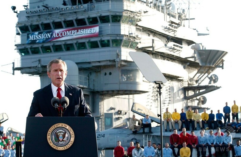 ブッシュ氏がイラクにおける大規模戦闘作戦の終了を宣言すると、その背後に「任務完了」と大きく書かれた横断幕が掲げられた。だがその言葉とは裏腹に、その後数年間にわたって激しい戦闘が続き、この「任務完了」発言は時期尚早だったとみなされた。