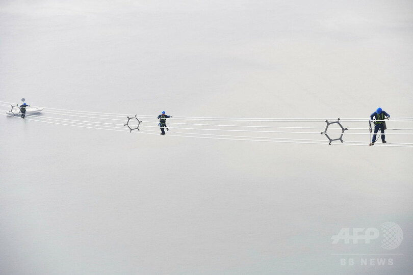 今回つながったか所は全線の中で最も重要な部分で、塔の高さ225.2メートル、塔の重量は1259トン、横断する送電線は1790メートルに達する。