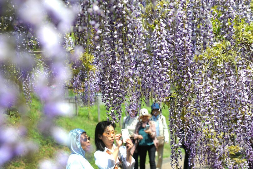 【4月20日 AFPBB News】神奈川県横須賀市の「横須賀しょうぶ園(Yokosuka Iris Garden)」では20日、フジの花が咲き誇り、汗ばむような陽気と芳香に誘われた見物客でにぎわいを見せている。