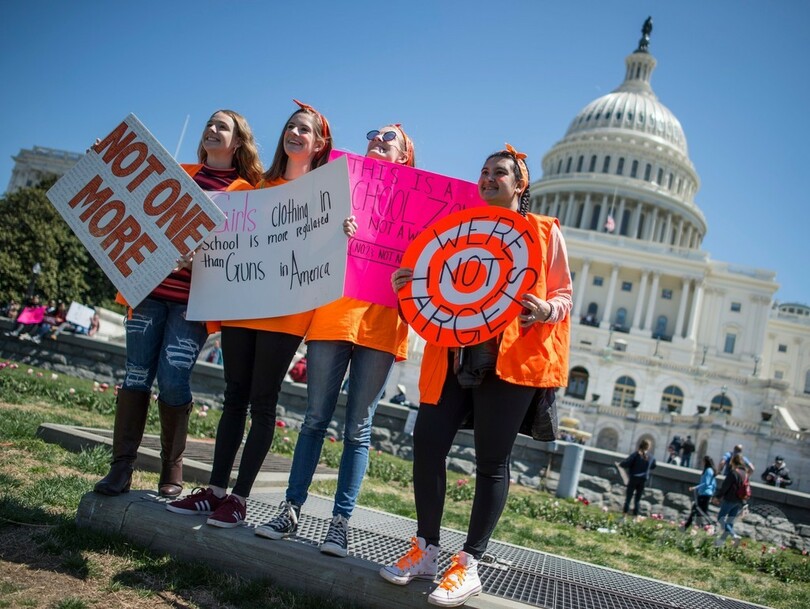 全米各地では同日、13人が死亡した1999年のコロンバイン高校銃乱射事件の発生日に合わせ、高校生らが授業を抜け出しデモを実施。デモを組織したのは、今年2月14日に生徒14人と職員3人が犠牲となった銃乱射事件が起きたフロリダ州パークランド(Parkland)のマージョリー・ストーンマン・ダグラス高校(Marjory Stoneman Douglas High School)の生徒らだった。(c)AFP/Chris Lefkow and Cyril Julien