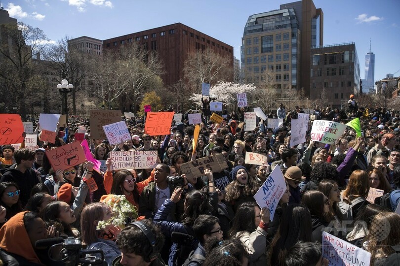 全米各地では同日、13人が死亡した1999年のコロンバイン高校銃乱射事件の発生日に合わせ、高校生らが授業を抜け出しデモを実施。デモを組織したのは、今年2月14日に生徒14人と職員3人が犠牲となった銃乱射事件が起きたフロリダ州パークランド(Parkland)のマージョリー・ストーンマン・ダグラス高校(Marjory Stoneman Douglas High School)の生徒らだった。(c)AFP/Chris Lefkow and Cyril Julien