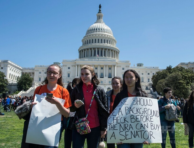 全米各地では同日、13人が死亡した1999年のコロンバイン高校銃乱射事件の発生日に合わせ、高校生らが授業を抜け出しデモを実施。デモを組織したのは、今年2月14日に生徒14人と職員3人が犠牲となった銃乱射事件が起きたフロリダ州パークランド(Parkland)のマージョリー・ストーンマン・ダグラス高校(Marjory Stoneman Douglas High School)の生徒らだった。(c)AFP/Chris Lefkow and Cyril Julien