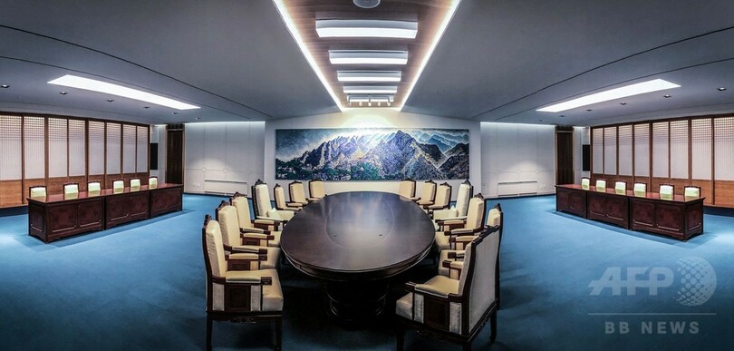 【4月25日 AFP】韓国大統領府(青瓦台、Blue House)は25日、目前に控えた南北首脳会談の会場となる施設の写真を公開した。軍事境界線上の板門店(Panmunjom)にある施設の椅子には、日韓両国が領有権を主張する竹島(Takeshima、韓国名・独島、Dokdo)が描かれている。