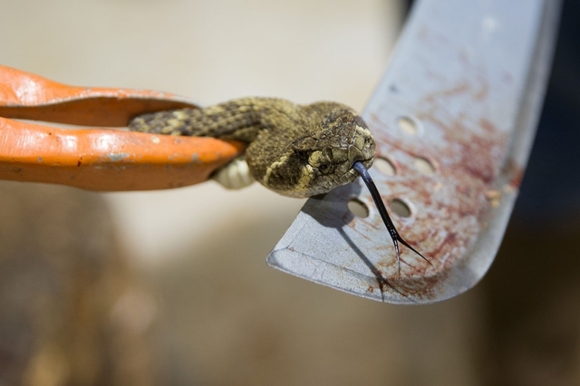 米テキサス州ノーラン郡スイートウオーターの「スイートウオーター・ガラガラヘビ狩り祭り」で来場客に示された、体を切り落とされた直後にまだ生きている兆候を見せるヘビの頭(2018年3月10日撮影)。(c)AFP / Loren Elliott