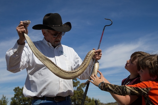 米テキサス州ノーラン郡スイートウオーターで開催された「スイートウオーター・ガラガラヘビ狩り祭り」の期間中、狩りに行ってジェイソン・ファーマーさんの子どもたちにヘビを見せるクリフ・ジョーンズさん(2018年3月10日撮影)。(c)AFP / Loren Elliott