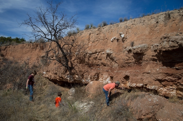 米テキサス州ノーラン郡スイートウオーターで開催された「スイートウオーター・ガラガラヘビ狩り祭り」の期間中、狩りに出かけるジェイソン・ファーマーさんと7歳と9歳の息子2人(2018年3月10日撮影)。(c)AFP / Loren Elliott