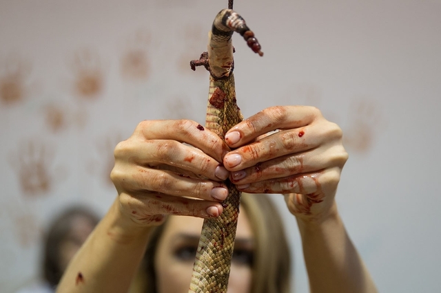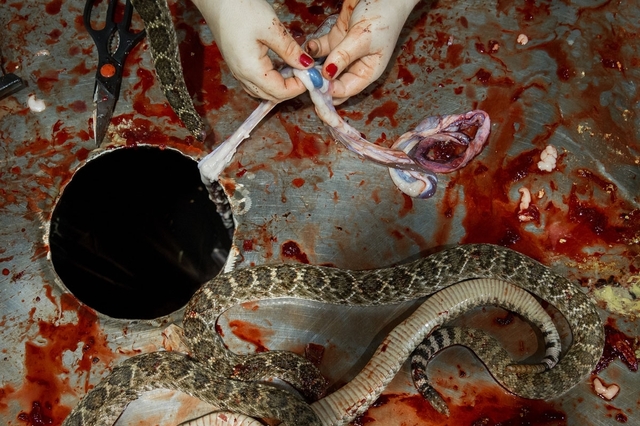 特にむごたらしく異様なのは、ヘビの皮剥ぎコーナーだった。ヘビの皮を剥ぐのは血みどろの作業だ。身から皮を剥ぐと、辺り一面にヘビの血が飛び散る。