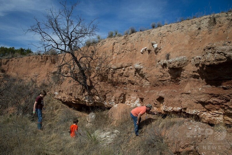 米テキサス州ノーラン郡スイートウオーターで開催された「スイートウオーター・ガラガラヘビ狩り祭り」の期間中、狩りに出かけるジェイソン・ファーマーさんと7歳と9歳の息子2人(2018年3月10日撮影)。(c)AFP / Loren Elliott