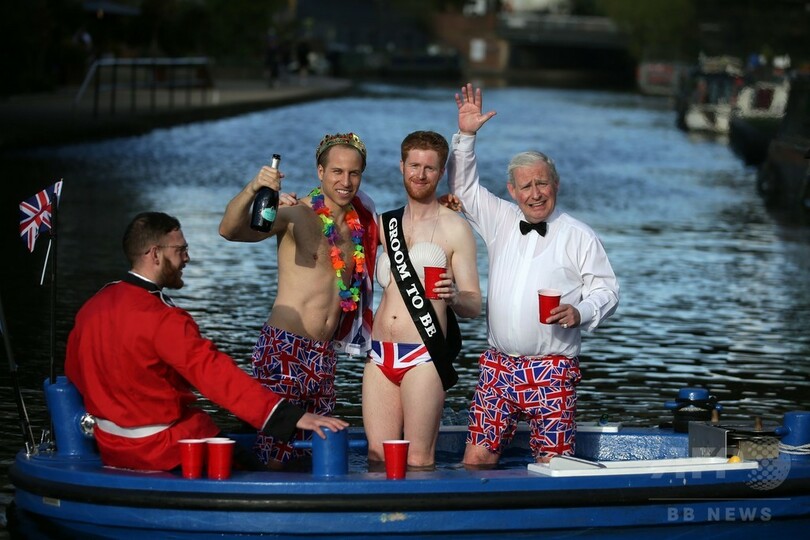 【4月27日 AFP】英国旗柄の水着を着て祝杯を挙げるウィリアム王子(Prince William)、ヘンリー王子(Prince Harry)、そしてチャールズ皇太子(Prince Charles)――?ノリノリだが、実は全員そっくりさん。起業家グループによって企画されたヘンリー王子の結婚式の前祝いで、3人のそっくりさんがテムズ(Thames)川に浮かべたホットタブに漬かりながら、ヘンリー王子とメーガン・マークル(Meghan Markle)さんを祝福した。(c)AFP