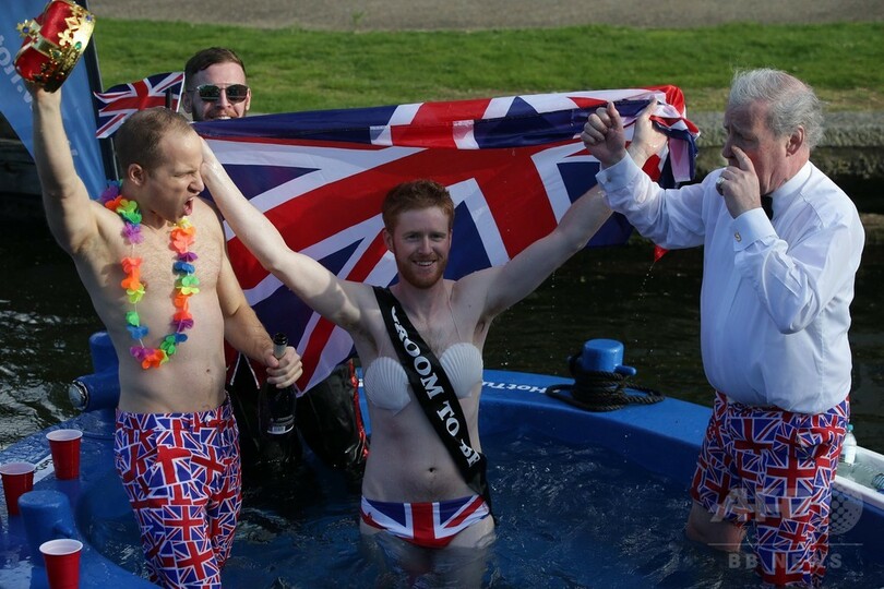 【4月27日 AFP】英国旗柄の水着を着て祝杯を挙げるウィリアム王子(Prince William)、ヘンリー王子(Prince Harry)、そしてチャールズ皇太子(Prince Charles)――?ノリノリだが、実は全員そっくりさん。起業家グループによって企画されたヘンリー王子の結婚式の前祝いで、3人のそっくりさんがテムズ(Thames)川に浮かべたホットタブに漬かりながら、ヘンリー王子とメーガン・マークル(Meghan Markle)さんを祝福した。(c)AFP