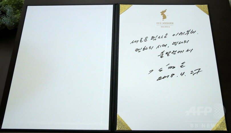 【4月27日 AFP】北朝鮮の金正恩(キム・ジョンウン、Kim Jong-Un)朝鮮労働党委員長は27日、南北軍事境界線上の板門店(Panmunjom)の韓国側にある施設「平和の家(Peace House)」で、韓国の文在寅(ムン・ジェイン、Moon Jae-in)大統領との歴史的な会談に先立って芳名録に記帳した。
