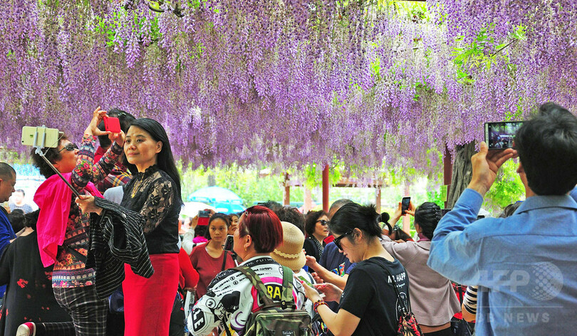 【4月28日 CNS】中国・上海市(Shanghai)の嘉定紫藤園(Jiading Wisteria Garden)のフジの花が最盛期を迎えた。園内を散策する観光客は、約100株の花の海を回遊していた。(c)CNS/JCM/AFPBB News