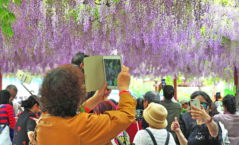 【4月28日 CNS】中国・上海市(Shanghai)の嘉定紫藤園(Jiading Wisteria Garden)のフジの花が最盛期を迎えた。園内を散策する観光客は、約100株の花の海を回遊していた。(c)CNS/JCM/AFPBB News