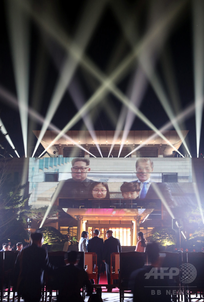 【4月28日 AFP】南北軍事境界線上の板門店(Panmunjom)の韓国側にある施設「平和の家(Peace House)」で27日、歴史的な南北首脳会談の終了を祝う式典で、この日に撮影された北朝鮮の金正恩(キム・ジョンウン、Kim Jong-Un)朝鮮労働党委員長と韓国の文在寅(ムン・ジェイン、Moon Jae-in)大統領の写真が投影された。(c)AFP