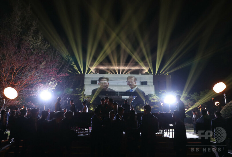 【4月28日 AFP】南北軍事境界線上の板門店(Panmunjom)の韓国側にある施設「平和の家(Peace House)」で27日、歴史的な南北首脳会談の終了を祝う式典で、この日に撮影された北朝鮮の金正恩(キム・ジョンウン、Kim Jong-Un)朝鮮労働党委員長と韓国の文在寅(ムン・ジェイン、Moon Jae-in)大統領の写真が投影された。(c)AFP