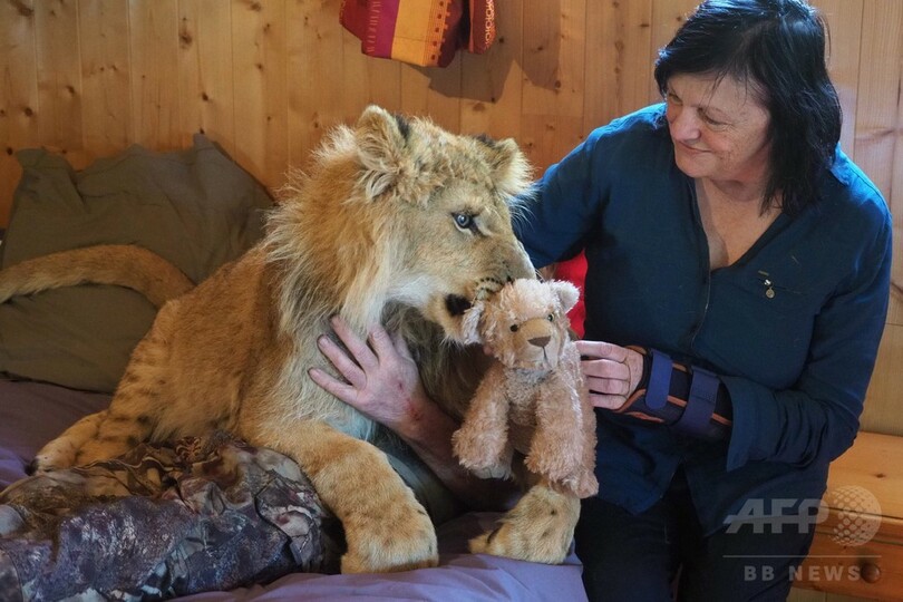 シンバが母親に食べられそうになったために一緒に暮らすことにしたが、シンバが成獣になったら囲いに戻す予定だという。(c)AFP