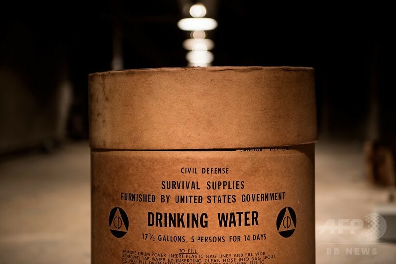 コンクリートの部屋は、工場などで使用されるようなランプがいくつもぶら下がり、薄暗く照らされている。「非常用備品」と書かれた円筒形の容器──水、薬、非常食、民間防衛マニュアルが入っている──がずらりと並んだ光景は、第2次世界大戦(World War II)後に旧ソ連との緊張が最高潮に達した時代の恐怖を呼び覚ます。