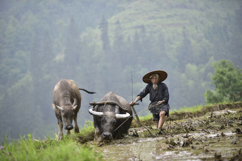 水牛と共に伝統の田起こし 農耕作業に追われる5月連休、貴州省