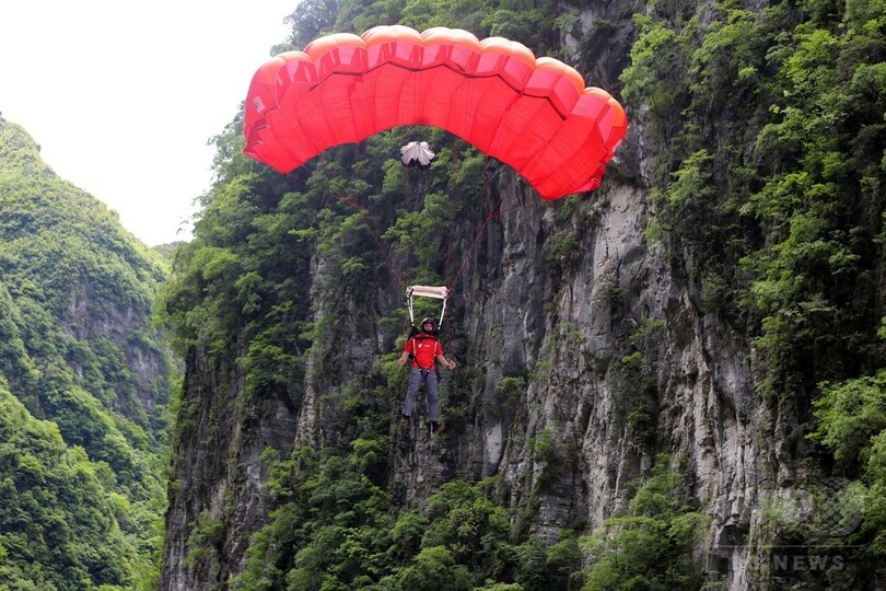 【5月7日 CNS】中国・重慶市(Chongqing)で、パラシュートを装着して高いところから飛び降りるベースジャンピングの世界大会が行われた。