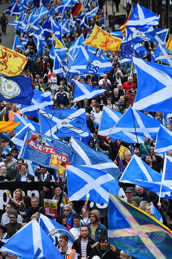 スコットランドで2014年に実施された独立の是非を問う住民投票は反対55%で否決された。以来、独立支持派のデモは毎年行われているが、当初、数千人規模だった参加者は昨年には約2万人へと増大。スコットランド行政府のニコラ・スタージョン(Nicola Sturgeon)首相は、英国の欧州連合(EU)離脱(ブレグジット、Brexit)によってスコットランドの国力が衰退するならば独立の是非を問う住民投票を再度実施すると警告している。
