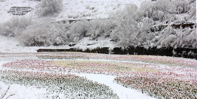夏ももうすぐだというのに、天山天池には大雪が降り、一面銀世界に変えてしまった。20万株のチューリップに真っ白な雪がかぶさり、まるで童話の世界のような景色が広がっている。(c)CNS/JCM/AFPBB News