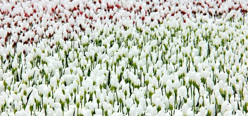 夏ももうすぐだというのに、天山天池には大雪が降り、一面銀世界に変えてしまった。20万株のチューリップに真っ白な雪がかぶさり、まるで童話の世界のような景色が広がっている。(c)CNS/JCM/AFPBB News