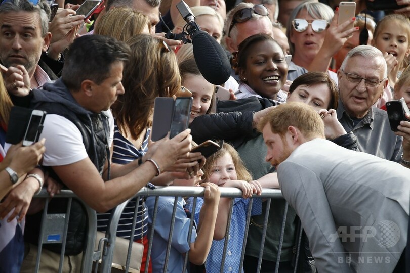 【5月19日 AFP】英国のヘンリー王子(Prince Harry)は18日、米女優メーガン・マークル(Meghan Markle)さんとの結婚式を翌日に控える中、式が行われるウィンザー城(Windsor Castle)の前に集まった、2人の結婚を祝福する大勢の人々に、兄のウィリアム王子(Prince William)とともにあいさつした。(c)AFP