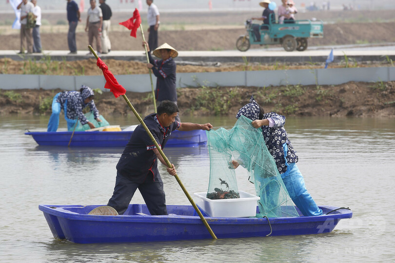 盱眙県は、中国内で「ザリガニの郷」と呼ばれるほどザリガニの産地として知られ、養殖池の面積は計約3万4000ヘクタールに上る。このうち、2万2000ヘクタール分は水田に生息する分を含む。年間の取引量は約10万トンで取引店舗は1500店舗以上、産業規模は70億元(約1220億円)を超えるとも言われている。(c)CNS/JCM/AFPBB News