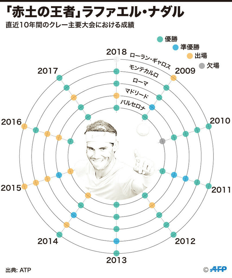 スポーツ テニス 図解 【図解】「赤土の王者」ナダル、クレー大会における圧倒的成績 2018年5月24日 12:23 発信地:パリ/フランス [ ヨーロッパ フランス ] このニュースをシェア 男子テニス、世界ランキング1位のラファエル・ナダルが、クレーコートの主要大会で残してきた直近10年間の成績をまとめた図解(2018年5月24日作成)。(c)AFP 【5月24日 AFP】男子テニス、世界ランキング1位のラファエル・ナダル(Rafael Nadal、スペイン)が、クレーコートの主要大会で残してきた直近10年間の成績をまとめた図解。(c)AFP テニス 一覧へ> メディア・報道関係・法人の方向け 写真・動画 購入のお問合せ>