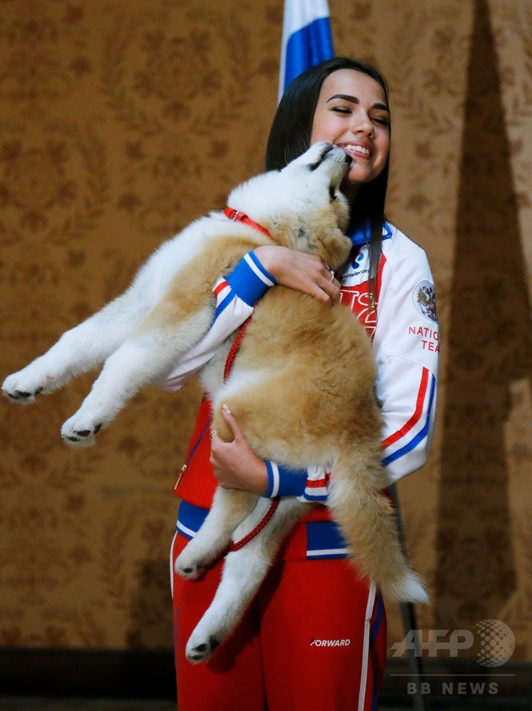 【5月27日 AFP】(写真追加)平昌冬季五輪のフィギュアスケート女子シングルで金メダルに輝いたアリーナ・ザギトワ(Alina Zagitova)が26日、モスクワで秋田犬を贈呈された。贈呈式にはロシア訪問中の安倍晋三(Shinzo Abe)首相も出席した。