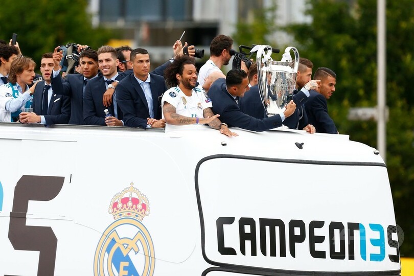 白塗りの大型バスには「Campeones 13(13度目の王者)」の文字があしらわれ、自らの最多記録を更新する通算13度目のチャンピオンズリーグ制覇を祝った。