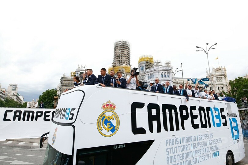 白塗りの大型バスには「Campeones 13(13度目の王者)」の文字があしらわれ、自らの最多記録を更新する通算13度目のチャンピオンズリーグ制覇を祝った。