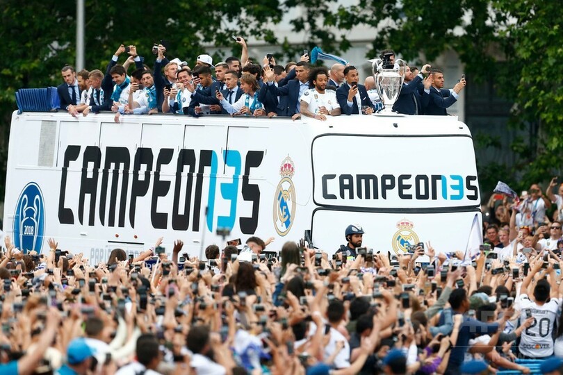 白塗りの大型バスには「Campeones 13(13度目の王者)」の文字があしらわれ、自らの最多記録を更新する通算13度目のチャンピオンズリーグ制覇を祝った。