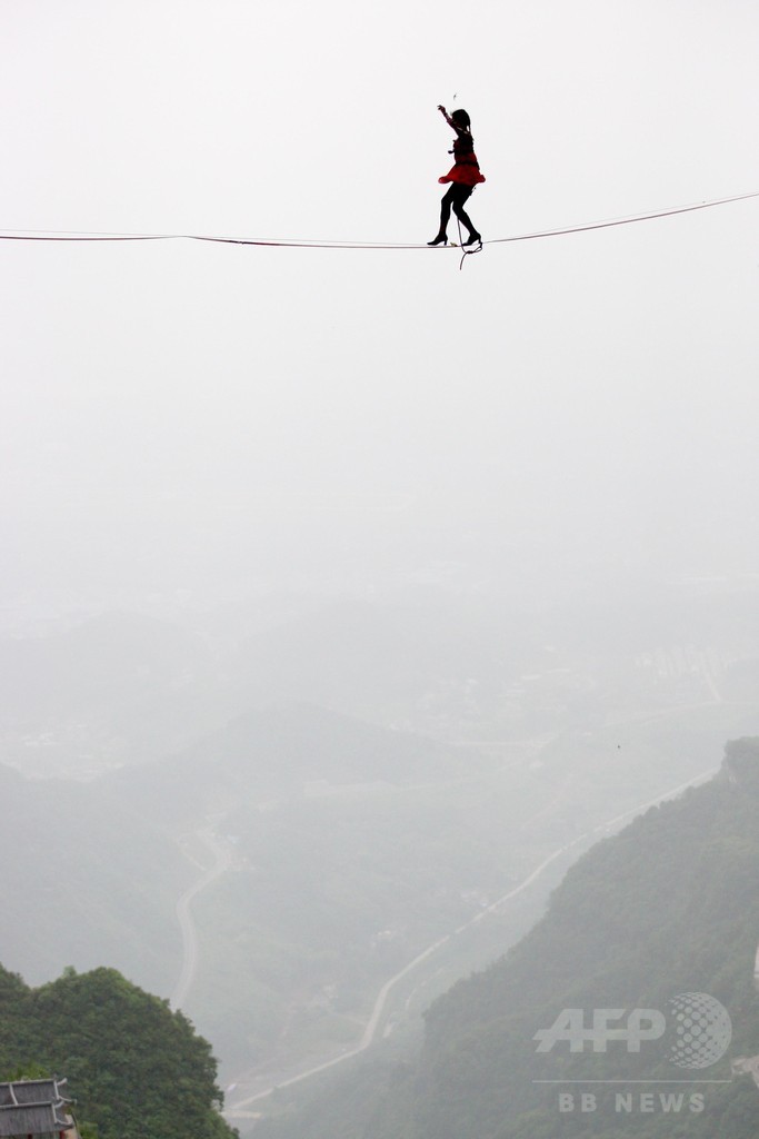 極限の綱渡りはハイヒールで 高さ1300メートル、湖南