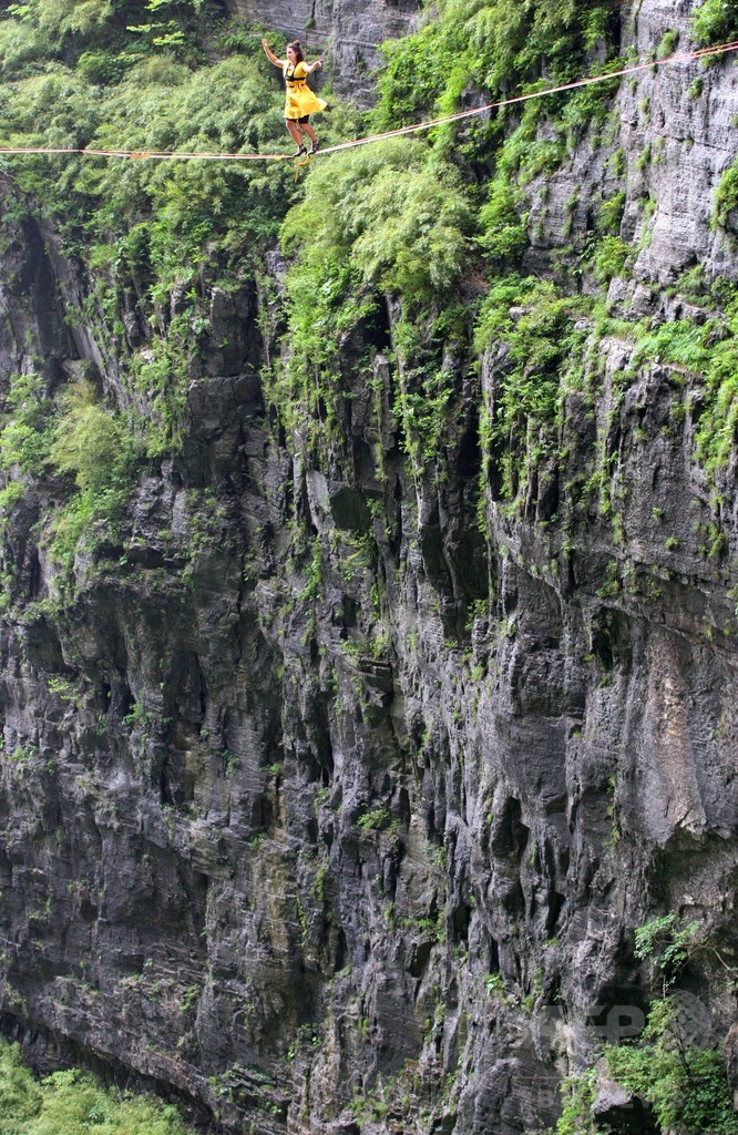 【6月2日 CNS】ハイヒールで綱渡りをするイベントが5月27日、中国・湖南省(Hunan)張家界(Zhangjiajie)天門山(Tianmen Mountain)で行われた。