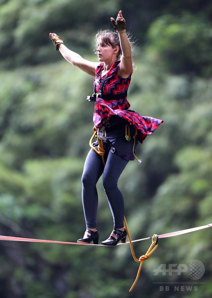 参加者は、ヒールの高さ5センチのハイヒールを履き、海抜約1300メートルある高所から長さ55メートルのロープを渡っていく。