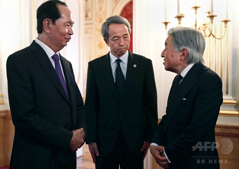 【6月3日 AFP】天皇、皇后両陛下は2日、東京・元赤坂の迎賓館を訪れ、離日を控えたベトナムのチャン・ダイ・クアン(Tran Dai Quang)国家主席夫妻に別れのあいさつをされた。クアン国家主席は国賓として先月末に来日していた。(c)AFP
