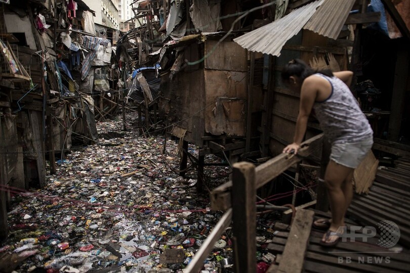 【6月6日 AFP】フィリピンの首都マニラのスラム街で、粗末な小屋の間を流れる小川はごみで覆われている。あまりにぎっしり詰まっているので、舗道のように歩けそうに見える。