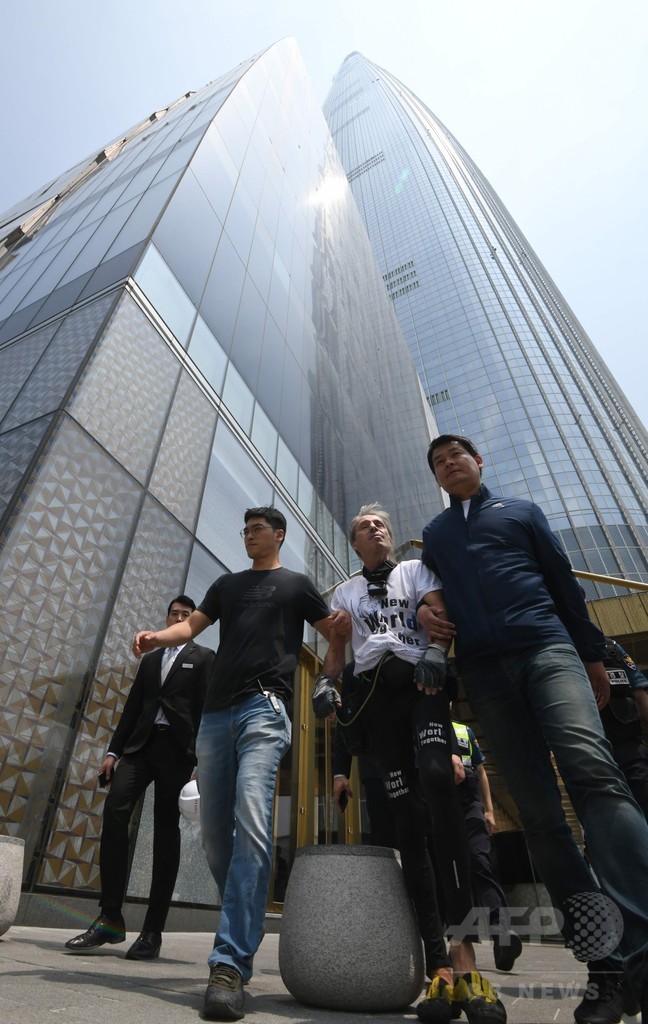 ロベールさんは世界で5番目に高い123階建てのビル「ロッテワールドタワー(Lotte World Tower)」に、ロープを使わず素手で登る一方、建物のスタッフらは内部からロベールさんを追跡。結局、メンテナンス用のゴンドラで屋上に連れて行かれ、逮捕された。
