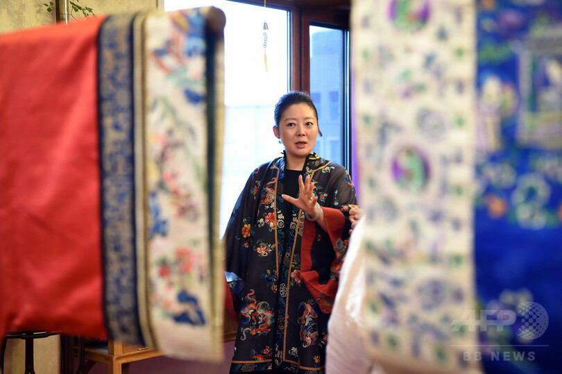 畢紅さんは20数年来、約千点の宮廷や典礼、祭祀などに使われる古典衣装や刺しゅう作品を収集。2013年からは、中国の伝統的衣装からインスピレーションを得て、現代のファッションデザインの中に取り入れ、古今を融合させた特徴あるファッションを創り出しているという。(c)CNS/JCM/AFPBB News