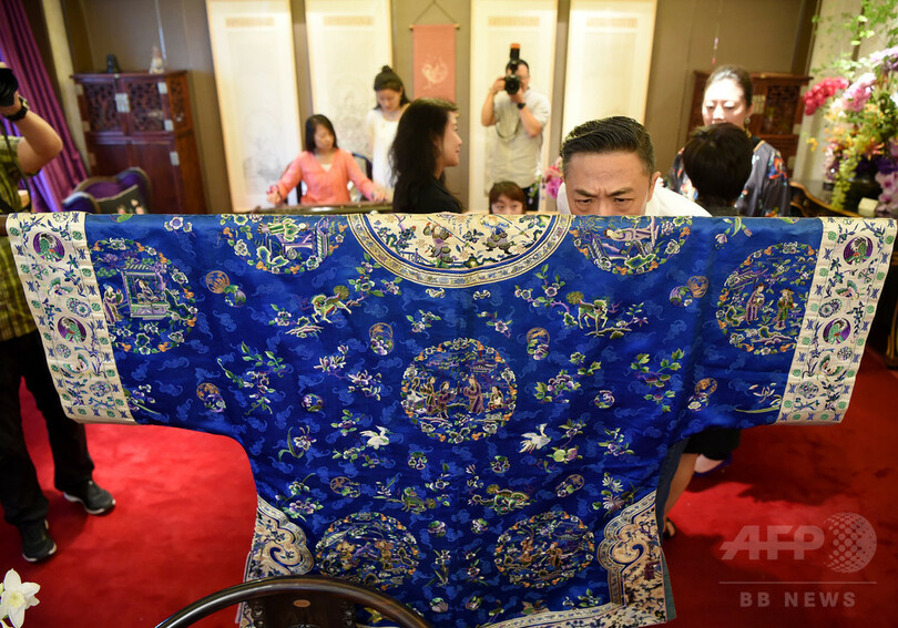 畢紅さんは20数年来、約千点の宮廷や典礼、祭祀などに使われる古典衣装や刺しゅう作品を収集。2013年からは、中国の伝統的衣装からインスピレーションを得て、現代のファッションデザインの中に取り入れ、古今を融合させた特徴あるファッションを創り出しているという。(c)CNS/JCM/AFPBB News